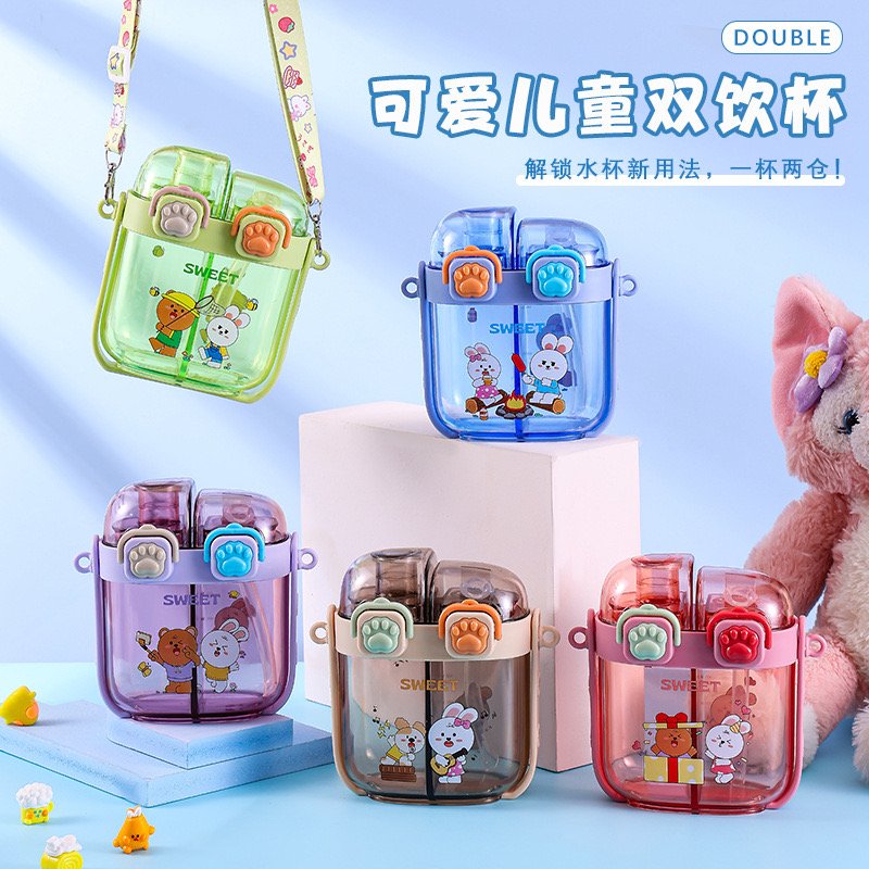 Perfect for kids, school, gym, or on-the-go adults, this 2-in-1 partition water bottle features separate chambers (typically 250ml each) with individual straws or sippers, so you can enjoy water and juice, or two different flavors without mixing. Leak-proof design, easy one-hand operation, and a carrying strap make it super convenient.